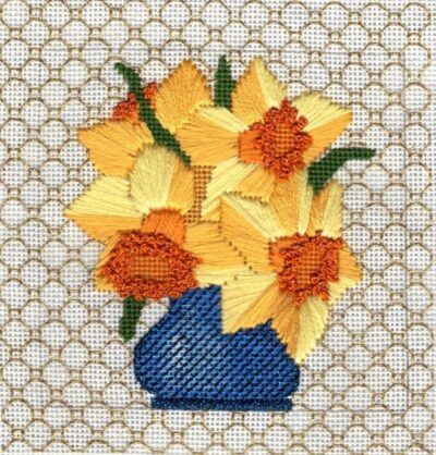 HO704 Daffodils, 4 inch, 18 mesh. Free stitch guide